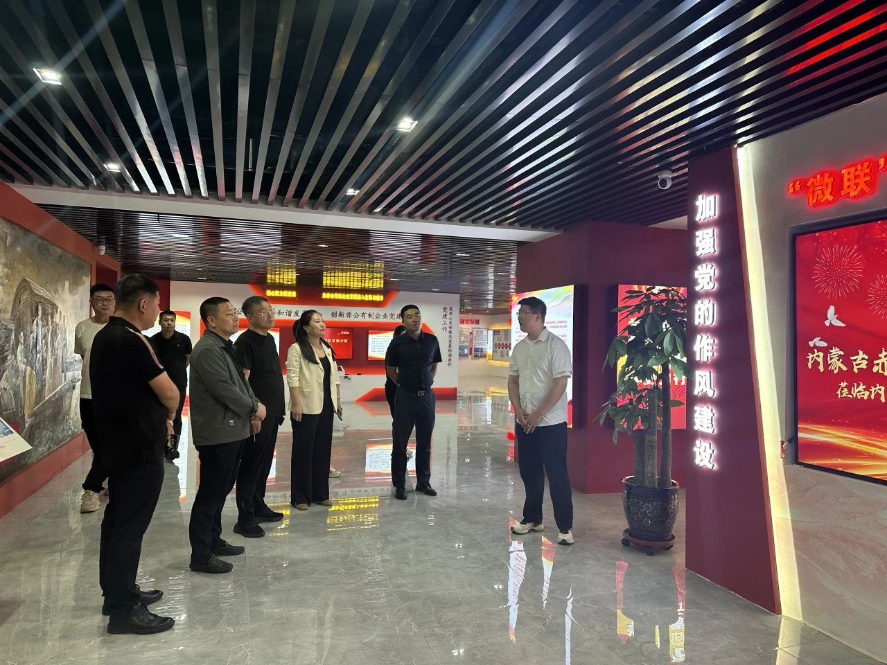赤峰市元寶山區統戰部部長張立濤一行參觀了“微聯”非公黨建共享陣地的黨建文化展廳,公司黨建講解員向其介紹了展廳的詳細情況。在簡短的講解中,張部長一行進一步了解了我公司打造的黨建品牌、發展方向和未來規矩等情況,同時,也對我公司取得的成績表示充分的肯定。