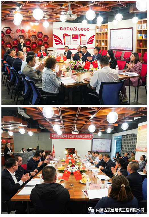 市委組織部干部劉珂妤,呼市民政局黨組成員副局長、呼市社會組織黨委書記李瑞俊,呼市社會組織黨委副書記郄海明,自治區住房和城鄉建設綠色研究發展中心(內蒙古自治區墻體材料革新發展中心)主任張少峰,呼市建筑業協會會長王海龍,呼市建筑業協會副會長兼秘書長李為革,10家共同體成員單位的黨組織負責人、黨務工作者、黨員、聯絡員等30多人參加了大會。