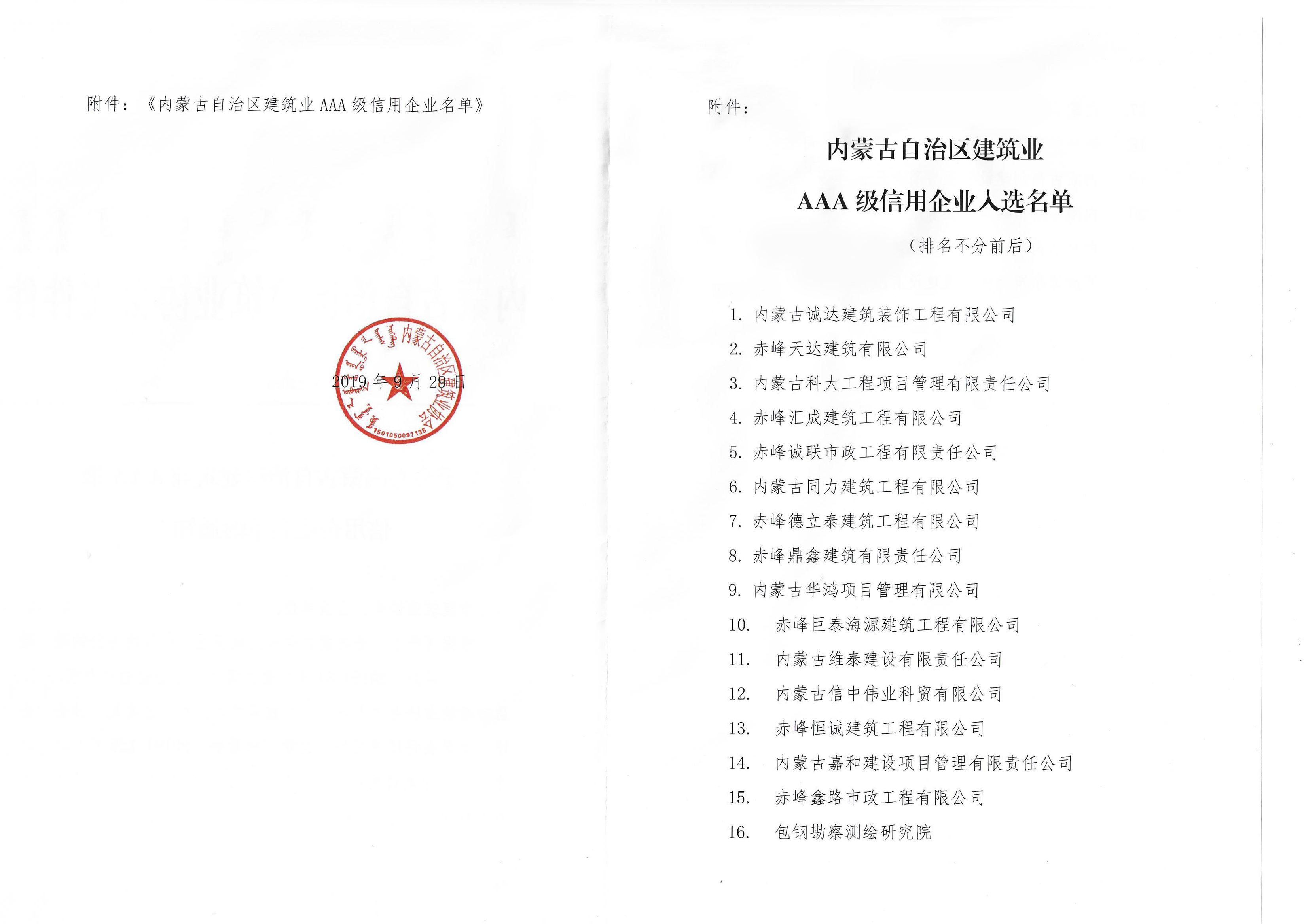 2019年內蒙古自治區建筑業AAA級信用企業名單的通知