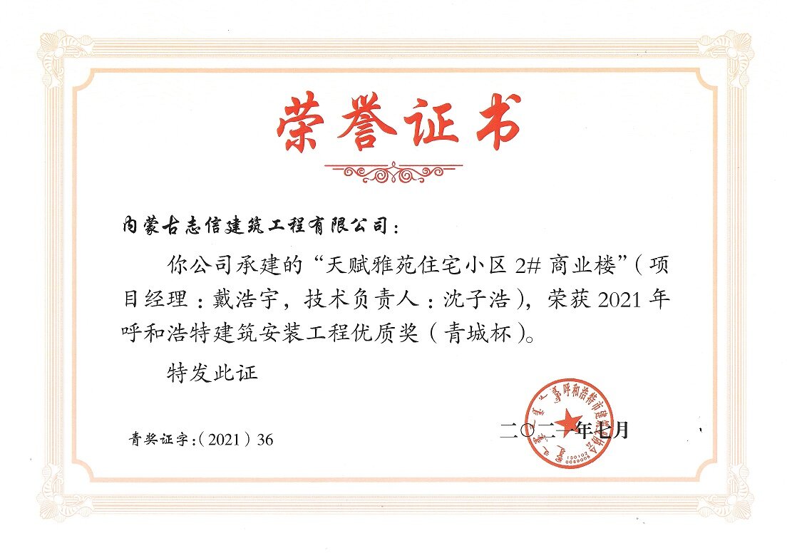 天賦雅苑住宅小區2#商業樓--榮獲2021年度呼和浩特建筑安裝工程優質獎(青城杯)