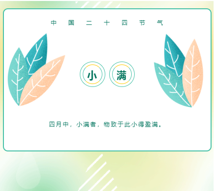 小滿(grain buds)是二十四節氣之一,夏季的第二個節氣。小滿——其含義是夏熟作物的籽粒開始灌漿飽滿,但還未成熟,只是小滿,還未大滿。每年5月20日到22日之間視太陽到達黃經60°時為小滿。