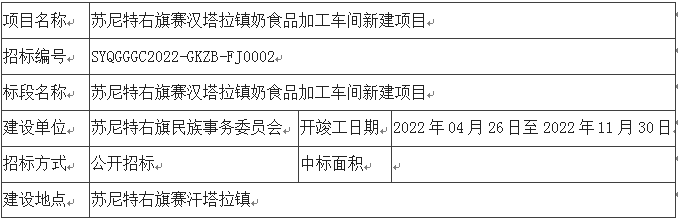 蘇尼特右旗賽漢塔拉鎮(zhèn)奶食品加工車間新建項目項目中標(biāo)公示